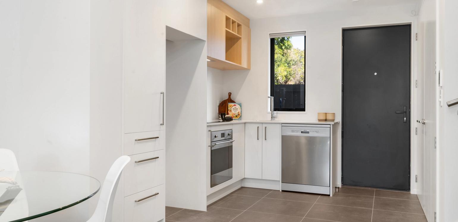 This three storey home has a carpark and features an open plan kitchen, dining and living area and laundry on the ground floor, a bedroom and bathroom on the middle floor and a bedroom and ensuite on the top floor.