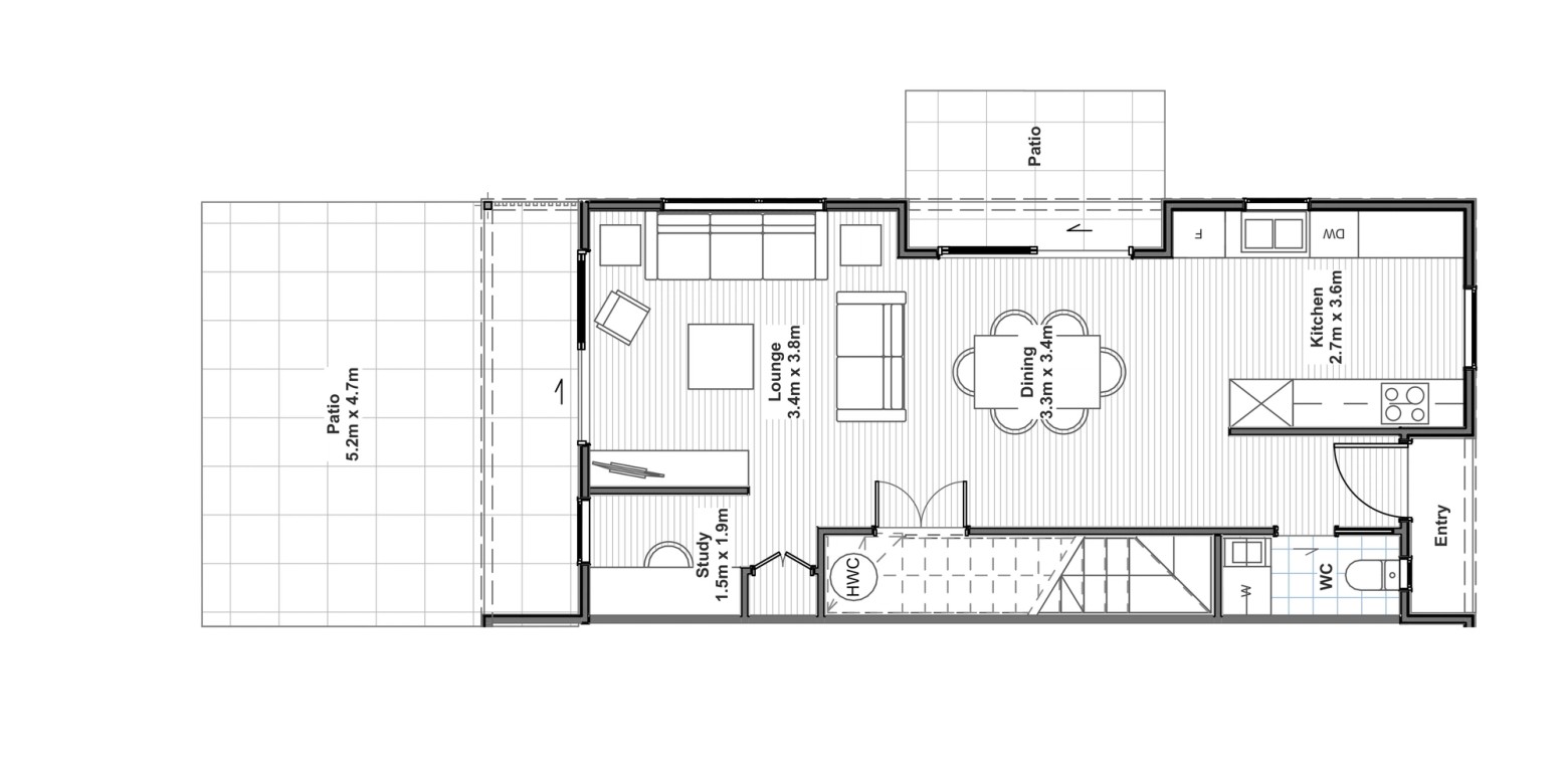 This two storey home has an off-street carpark, three double bedrooms, study, family bathroom, ensuite and a spacious open plan kitchen, dining and living area that opens out on to two separate entertaining areas.