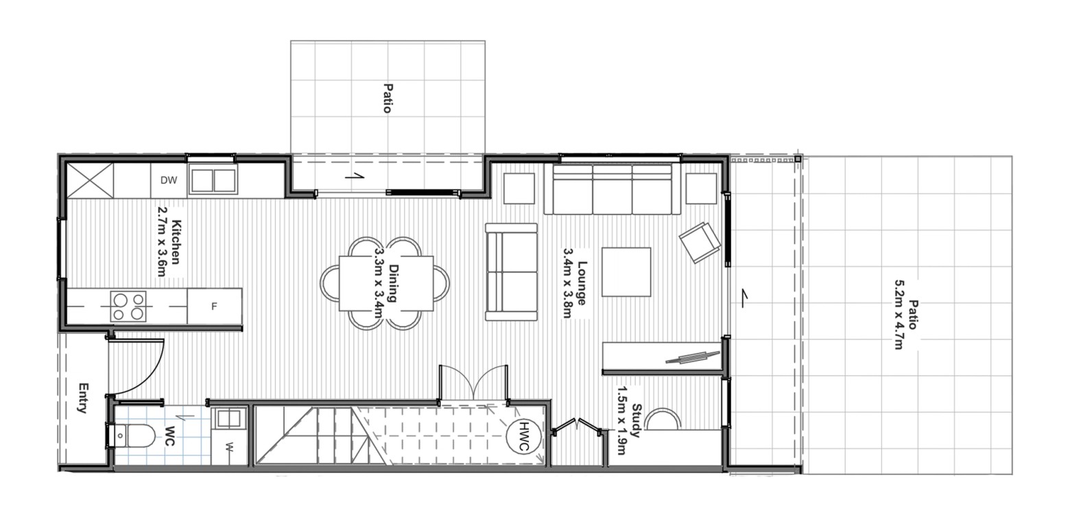 This two storey home has an off-street carpark, three double bedrooms, study, family bathroom, ensuite and a spacious open plan kitchen, dining and living area that opens out on to two separate entertaining areas.