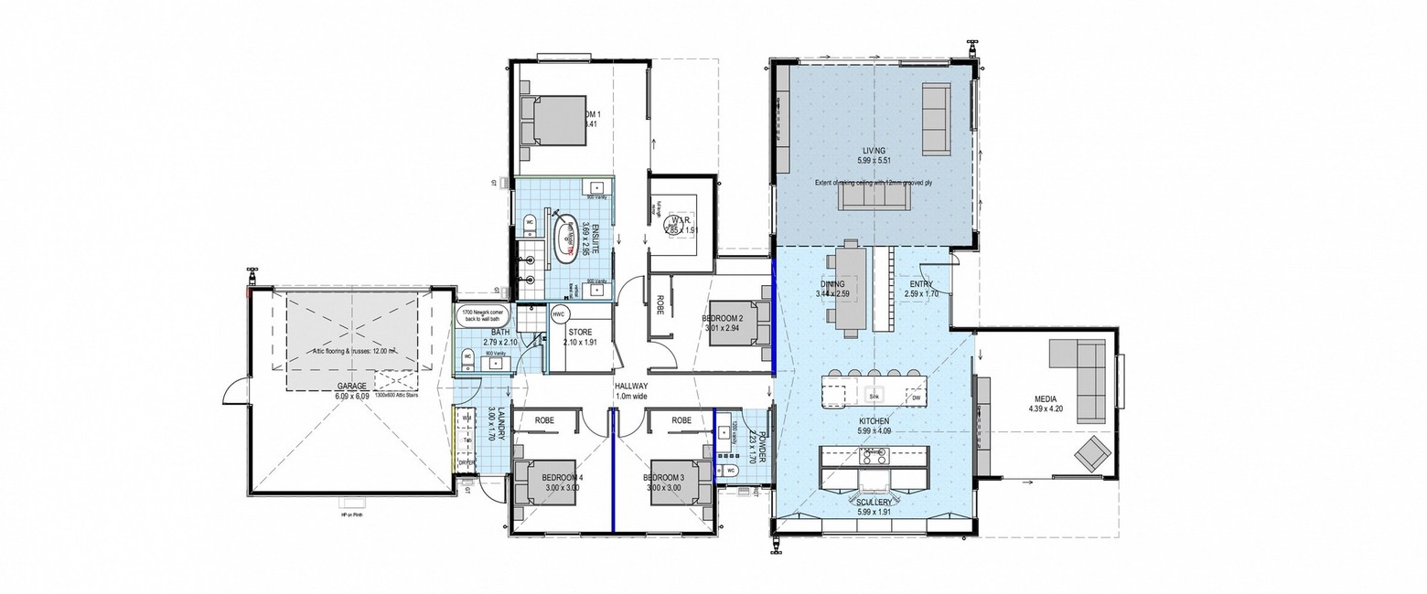 The light-filled open plan living can be credited to the abundance of skylights, the feature plywood cathedral ceiling and the large windows throughout. The kitchen has a full walk around pantry with built-in appliances as well as space for a wine fridge. Walk through the barn door and you'll find the cosy media room with stunning lighting and more built-in furniture.