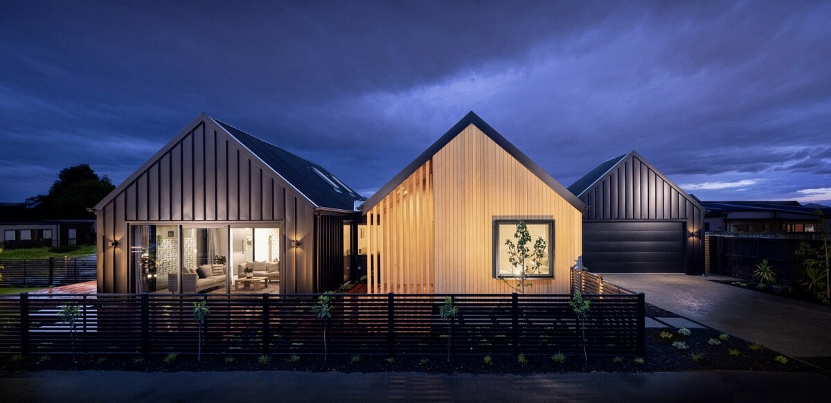 From the outset, our new Highsted showhome gives an architectural and sophisticated feel with vertical shiplap cedar and a Metalcraft profile paired with feature cedar slats throughout. Equally as impressive on the inside, you'll find breezeblocks cleverly separating the entry from the open plan kitchen, living and dining area which also doubles as seating for the dining area.